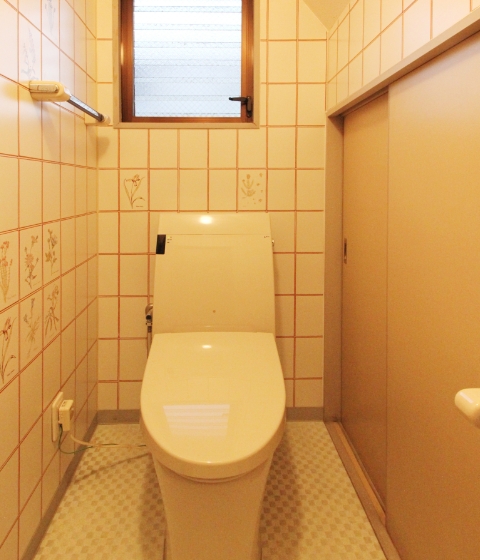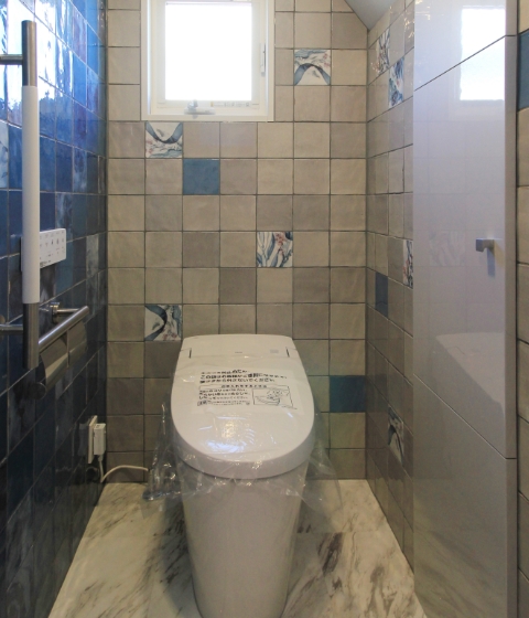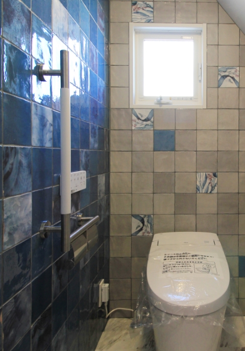 ▷ トイレはLIXIのサティスを採用。壁面には施主様が選んだデザインタイル。素敵な空間になりました。照明は消臭タイプ(プラズマクラスター)。人感センサー付で、自動でON/OFF。