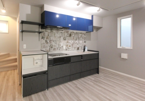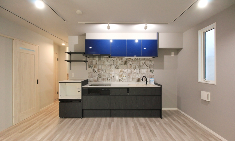 キッチンはLIXIのシエラSを採用。壁面には施主様が選んだデザインタイル。キッチンを照らすダウンライトは施主様のお気に入り。以前は家電の置き場がなく、キッチンが大きい割に使い勝手よくないというお悩みがあり、炊飯器、電子レンジの置き場を設けました。
