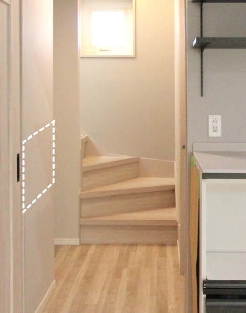 ▷ 奥深く、使いづらかった洗濯機ヨコの収納スペースはニッチ棚に変更。