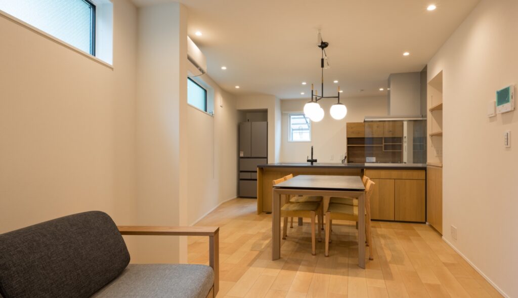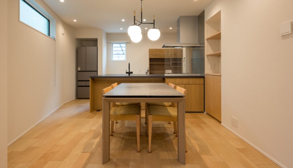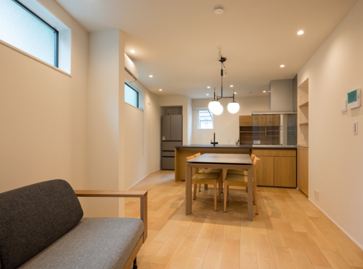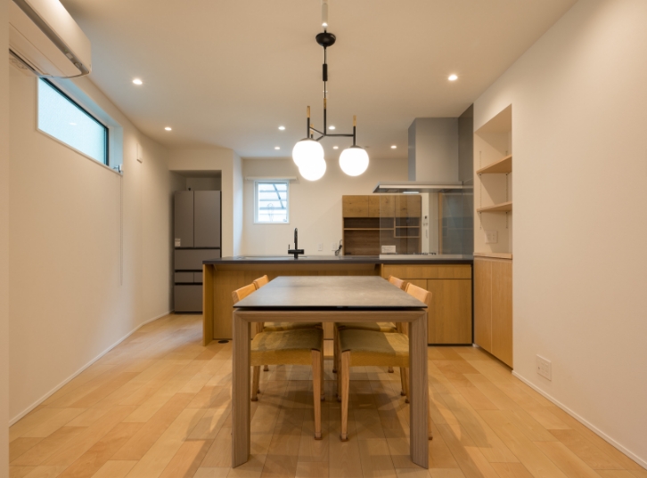 施主様の意向を受けて、天然木のフローリング、木目調のキッチンを採用。壁・天井は白で統一。自然な木目をいかしたナチュラルベーシックなインテリアに。照明にダウンライト、スポットライトを使用。壁面にあたる光により、シンプルな白壁も豊かな表情に。