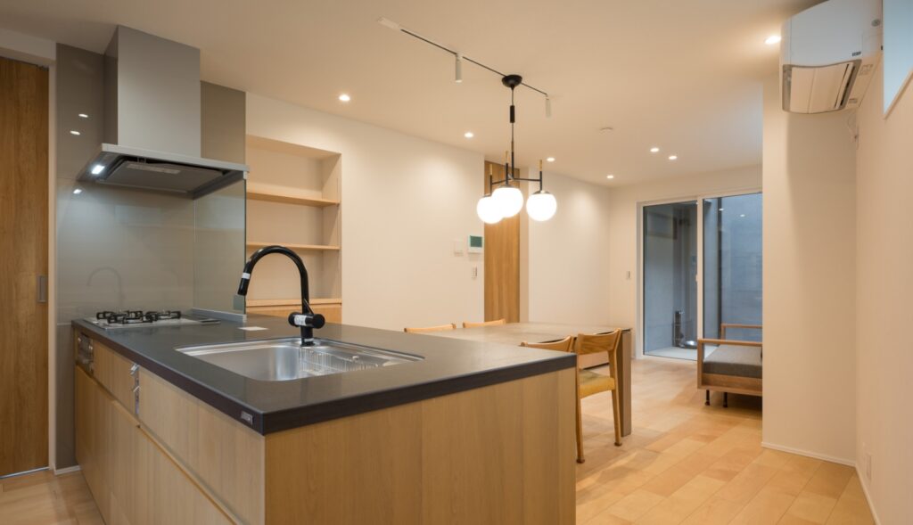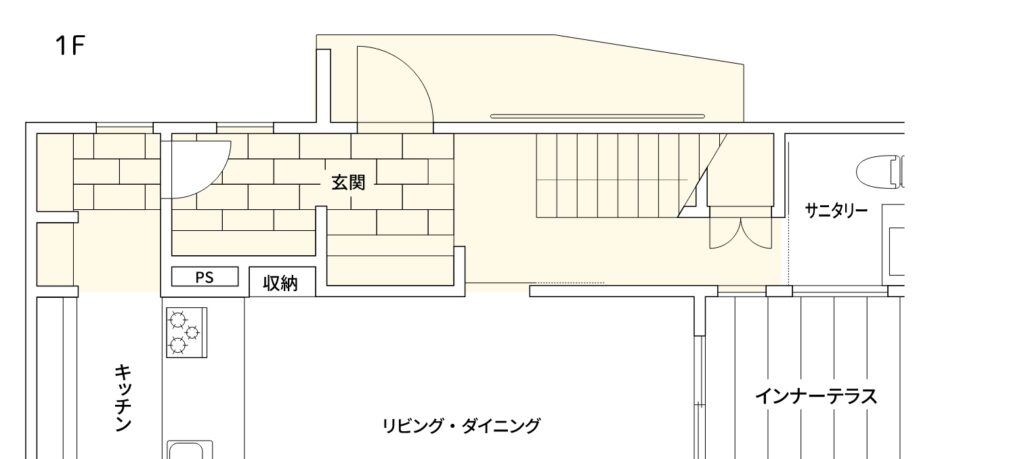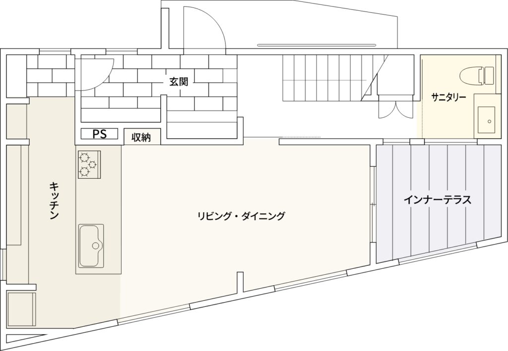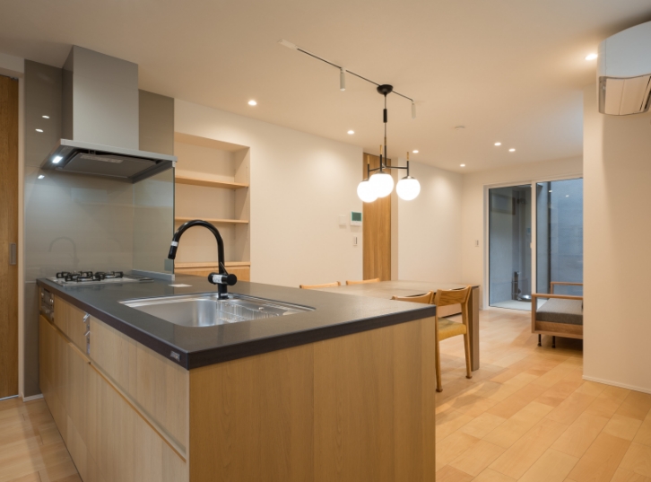 1階は「料理教室の開催」を想定し、機能的で広々としたダイニングキッチン中心の間取りに。東西南の三方を建物で囲まれているため、採光を確保できる高窓やインナーテラスを設置。