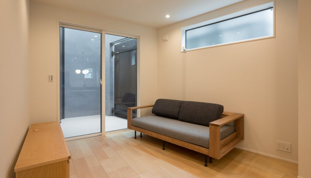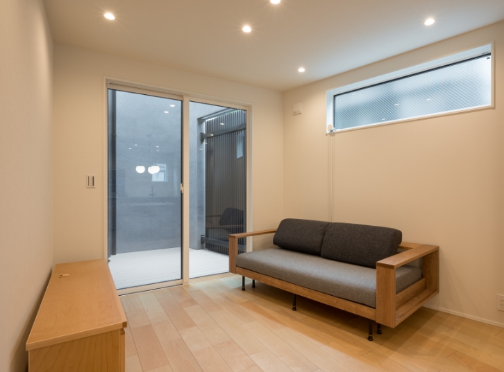 建物が隣接しているため、プライバシーと採光を考慮し、高窓を設置。サッシの向こうは室内テラス。空間にヌケができ、室内を広くみせる視覚効果が生まれています。追々は緑を配置する予定だそうです。