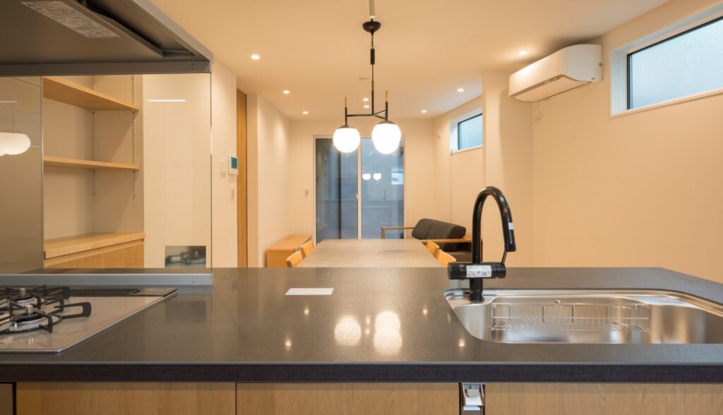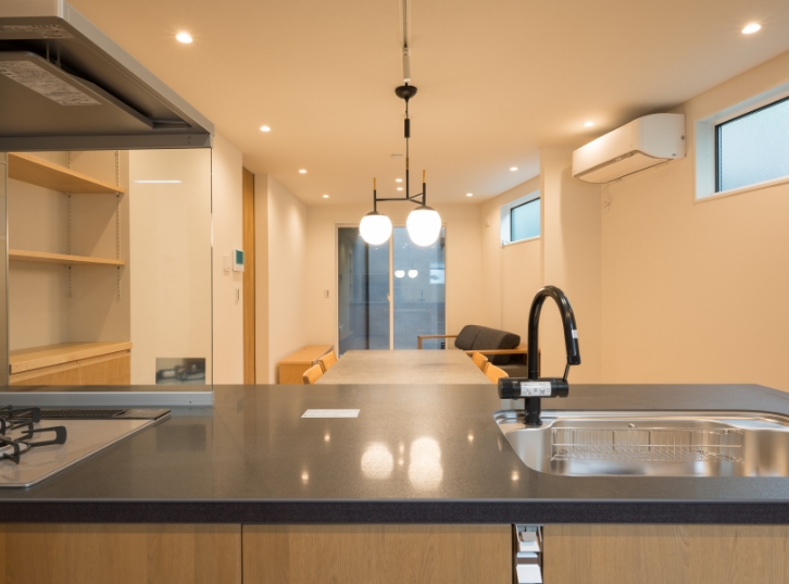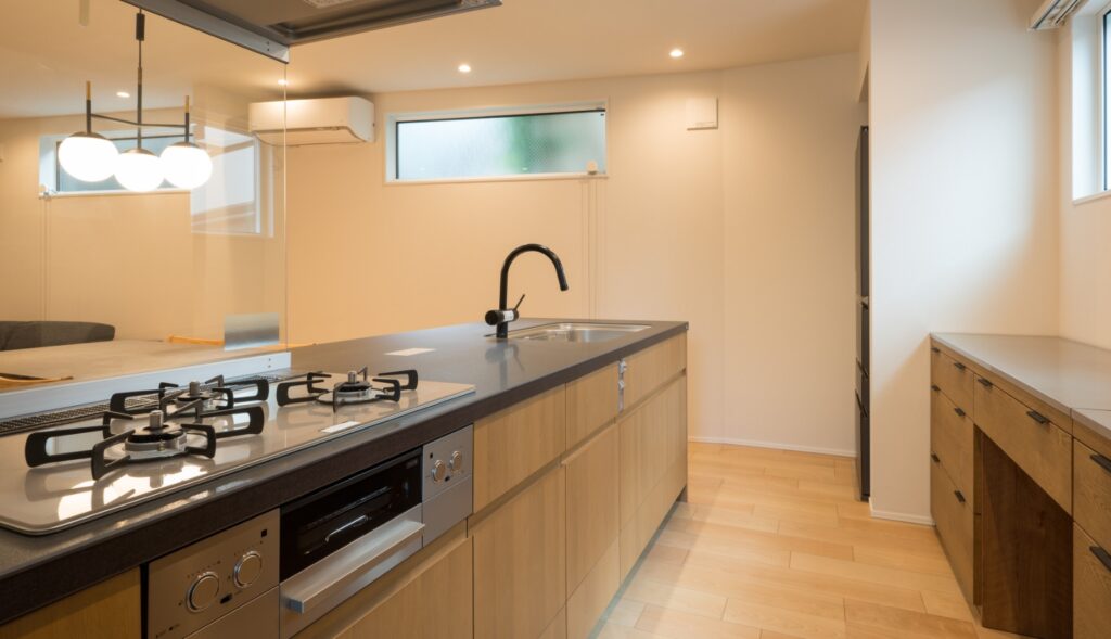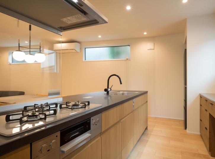 キッチンはLIXILの「リシェル」を採用。施主様のリクエストによりカラーは木目調、天板は黒を選択。