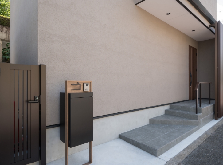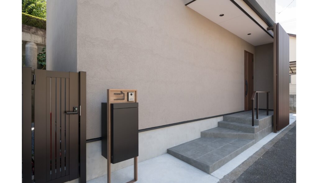 道路から玄関ドアまでの間に、階段と手すりを設けたアプローチ。ドア前には格子の目隠し。玄関ポーチには階段上部に雨よけとなる庇を設置。
