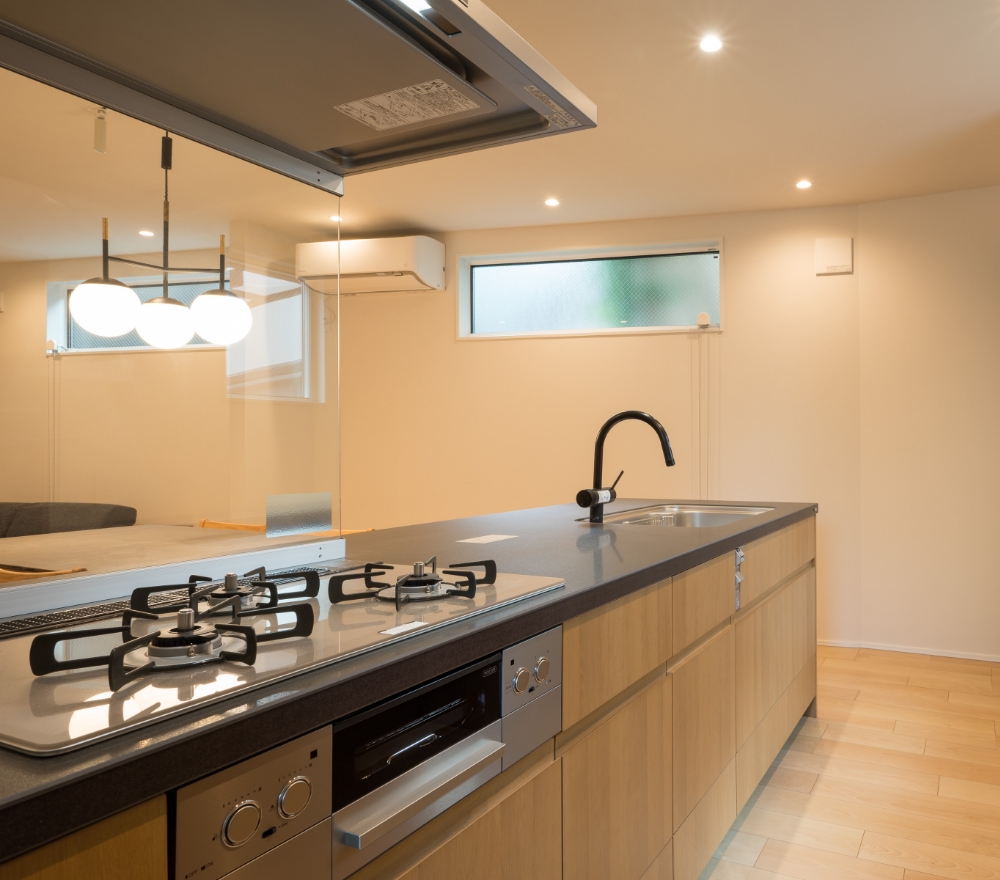 吊り戸棚がなく、フード下が油跳ね防止用の透明パネルのため、キッチンからDKへの視界が良好。