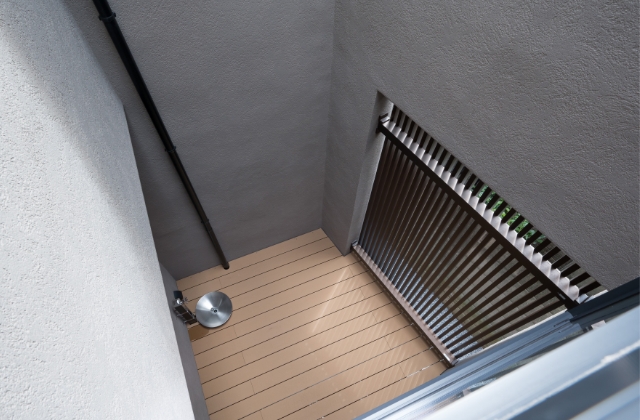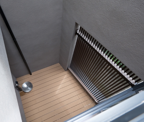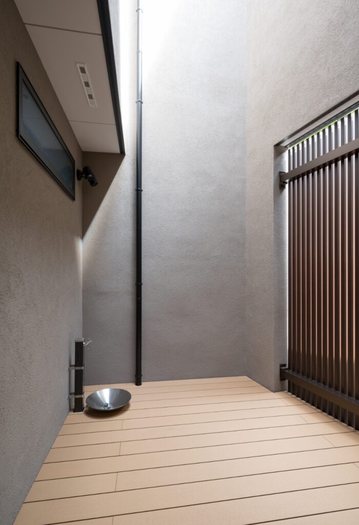 壁の一部はスリットフェンス。光を取り込みながら外からの目隠しに。一画に水場を設置。緑を育む予定だそうです。