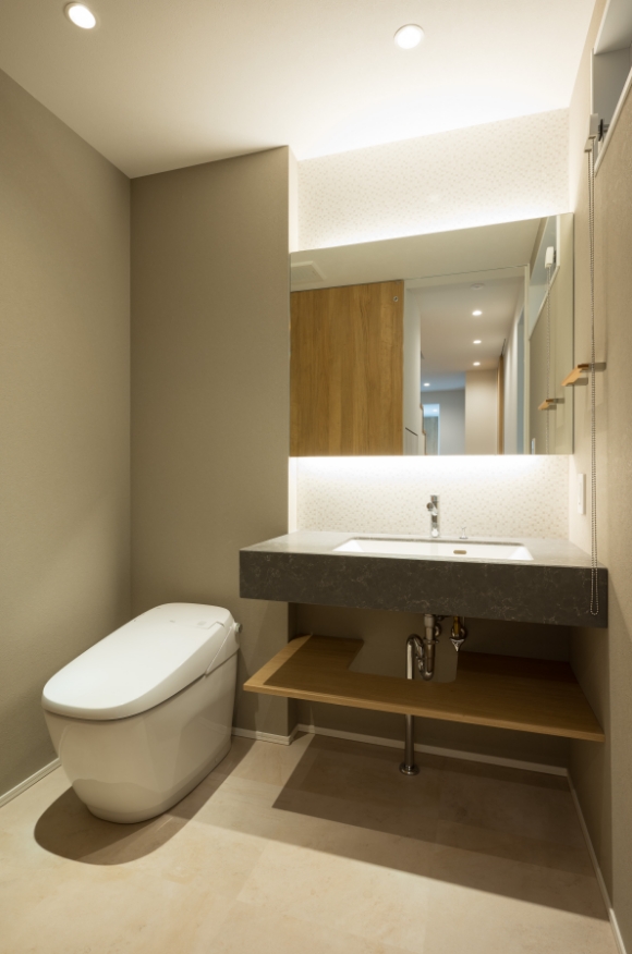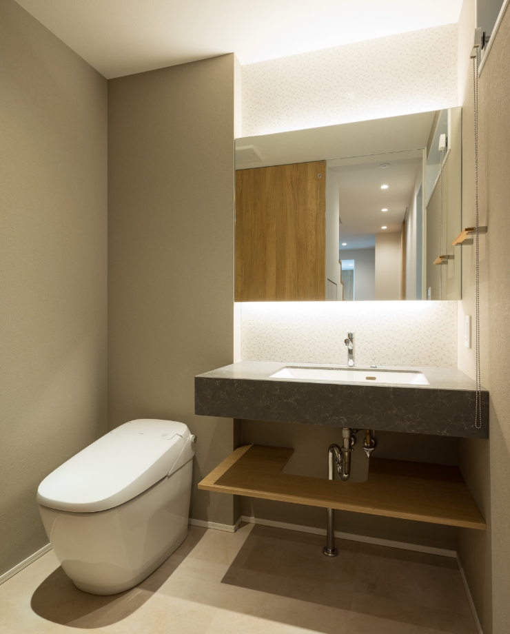 1階のトイレは来客を想定し、トイレ内に洗面を設け、ゆとりあるスペースを確保。壁面はグレー、床はベージュのタイル貼り。手洗いカウンターは大理石調仕上げ。照明はダウンライト、鏡の裏には間接照明。スタイリッシュな空間にまとめました。