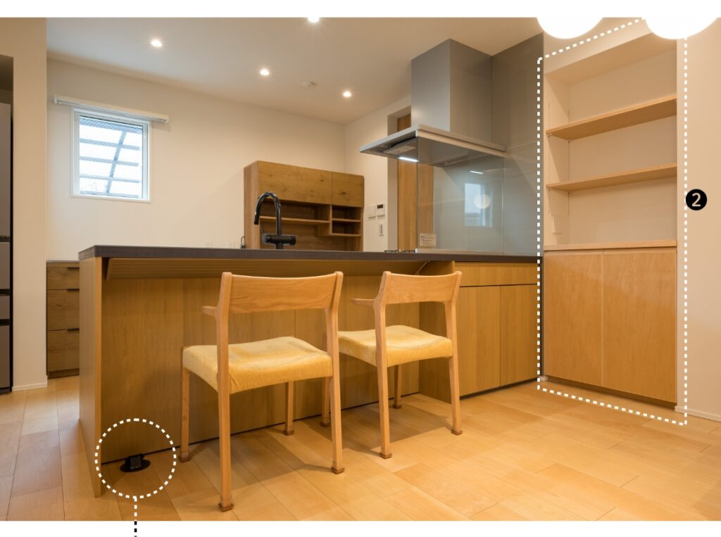 ❷カウンター横のニッチスペースに収納棚を造作。
