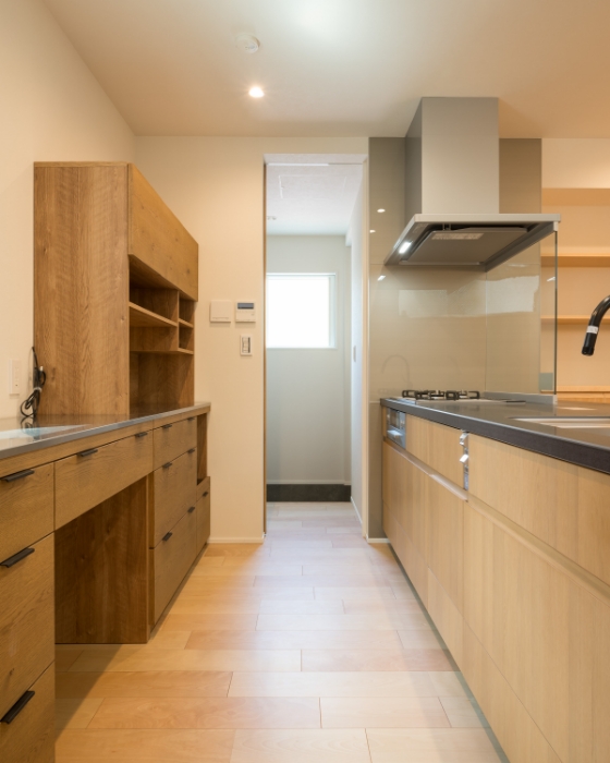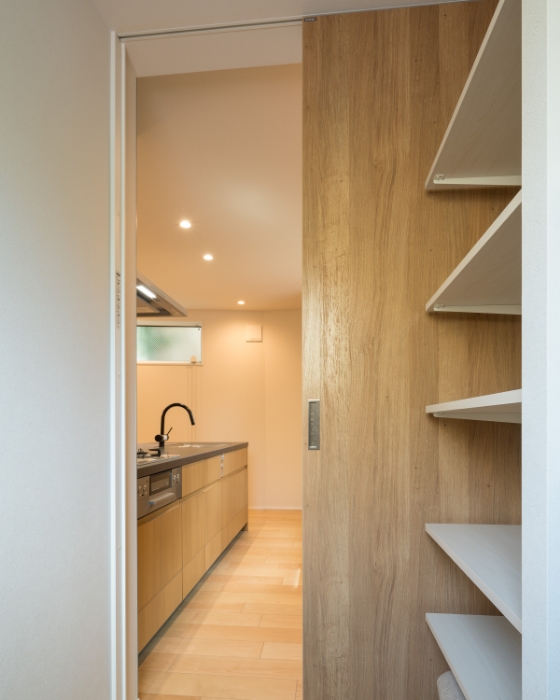 キッチン収納も木目調。キッチン奥のパントリーは玄関からのアプローチも可。