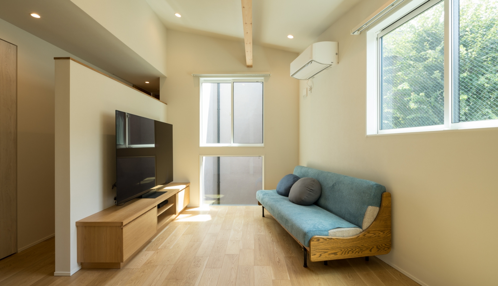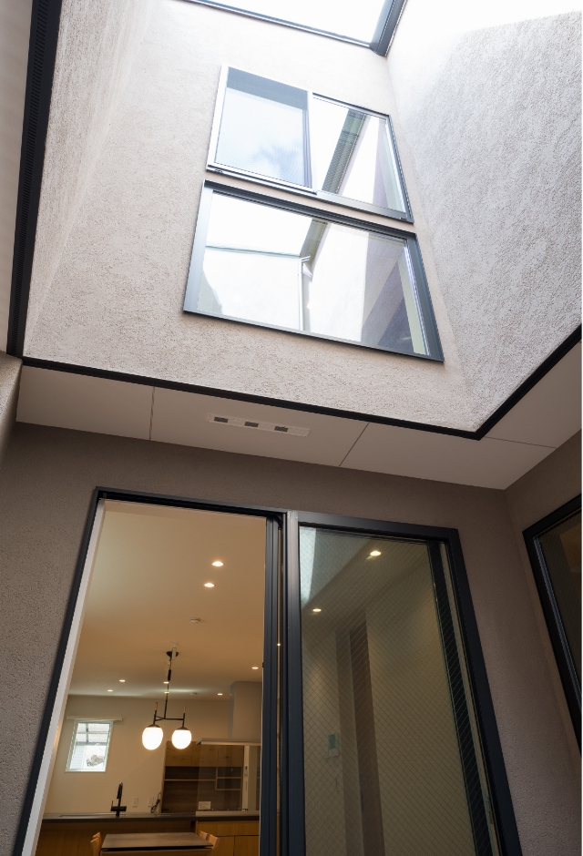 インナーテラス側に取った室内窓から光が差し込みます。空間にヌケができ、室内を広くみせる視覚効果も。