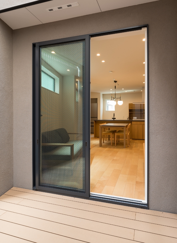 インナーテラスから室内をみた写真。部屋の延長として感じられるインナーテラスを配することで室内空間の広がりを演出。