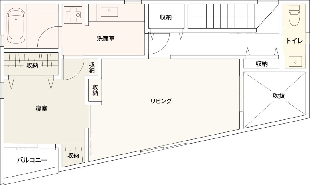 廊下側の壁の上部に“空き”を設け、空間の閉塞感が生まれることを防ぎました。冷暖房効率を考慮して、階段入り口と洗面化粧室入り口(図面参照)に扉を作り、廊下部分も含めて一部屋に。