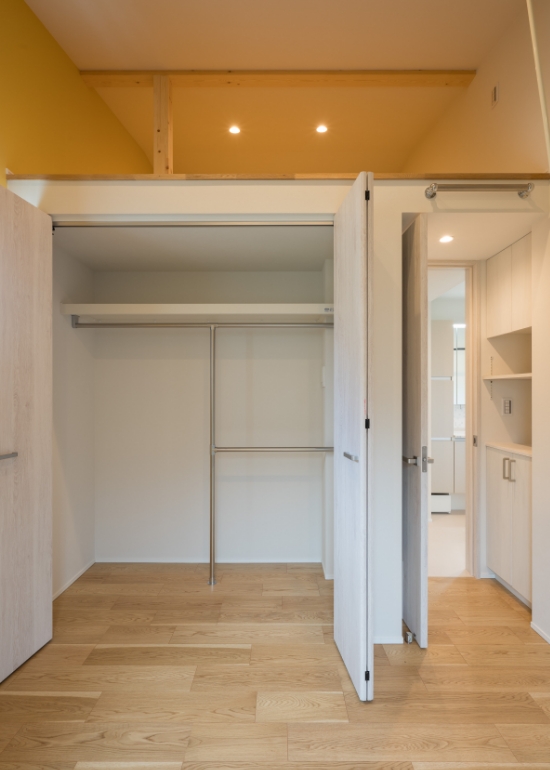 たっぷり収納できる広々クローゼット。サニタリーへのアプローチの壁面にも収納を造作。