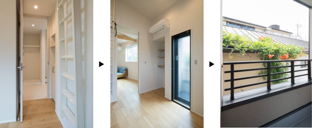 洗濯動線は 洗面室⇒寝室⇒バルコニー。
