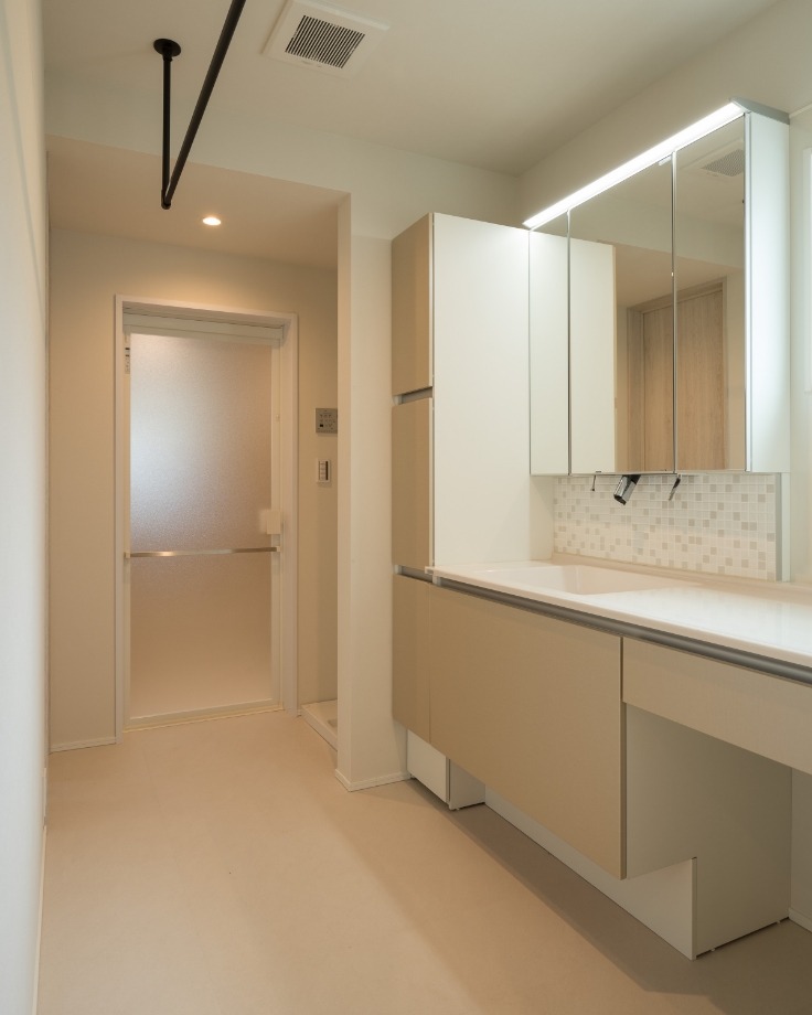 清潔感のある洗面化粧室は、収納を充実。天井には洗濯物を干すためのポールを設置。洗面室に湿気がこもらないよう浴室+洗面室の二室換気を採用。