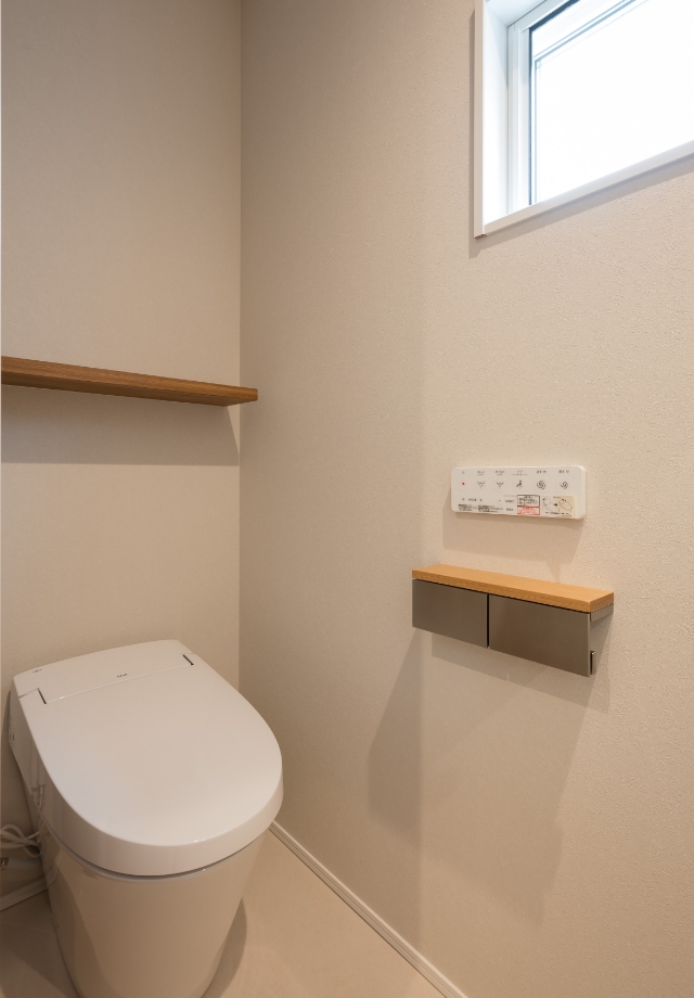 一階の来客用トイレとは異なり、施主様が日常使いされるトイレなので明るいグレーを基調としたシンプルで清潔感のあるデザインで統一。