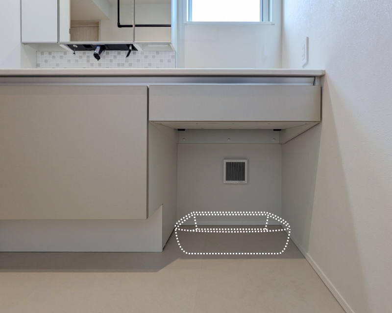 洗面カウンター下にはペットのトイレ置き場があり、匂い対策として換気扇を設置。
