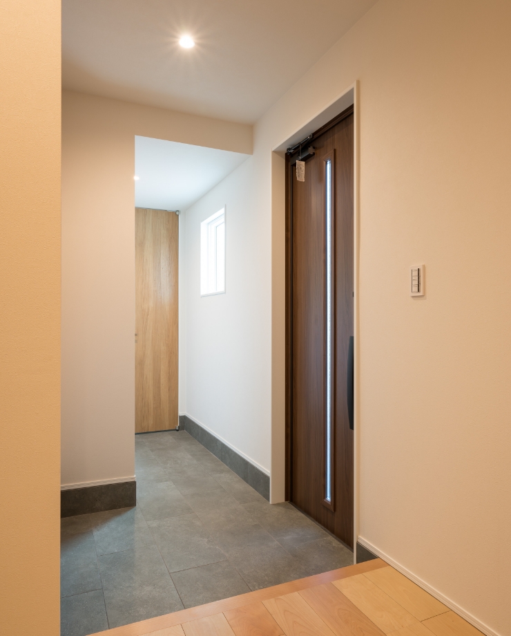 玄関照明は人感センサー。来客時や荷物で手が塞がっている時に便利。土間下には厚さ10cm ほどの断熱材。基礎部分内側にも断熱材が入っており、下からの底冷えを抑制。