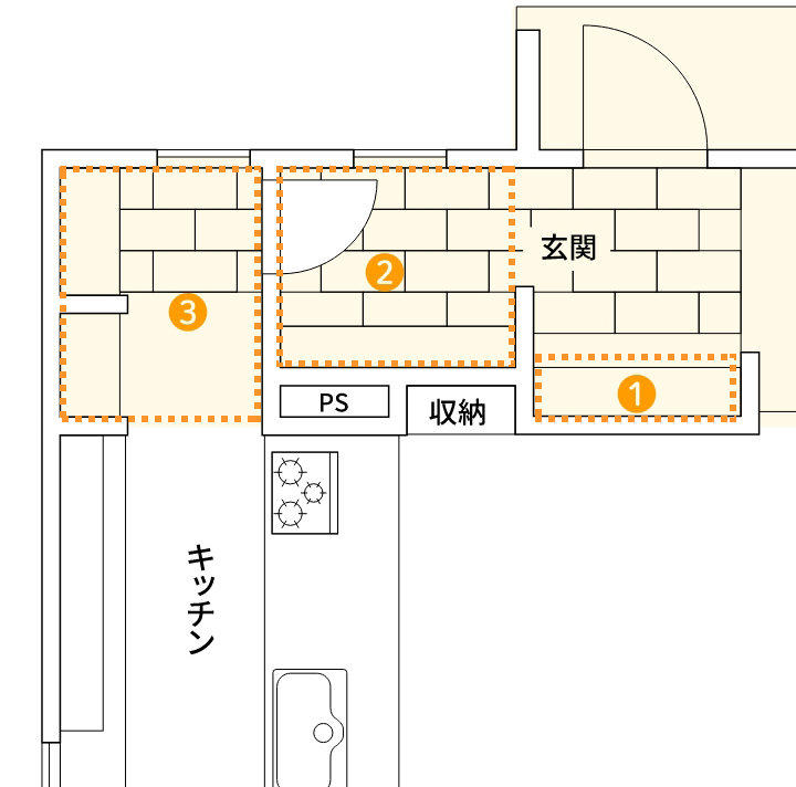 ❷玄関収納:玄関右奥に設置。自転車もしまえる広さ。壁には収納棚を設置。部屋まで持ち込みたくないものはここで保管。