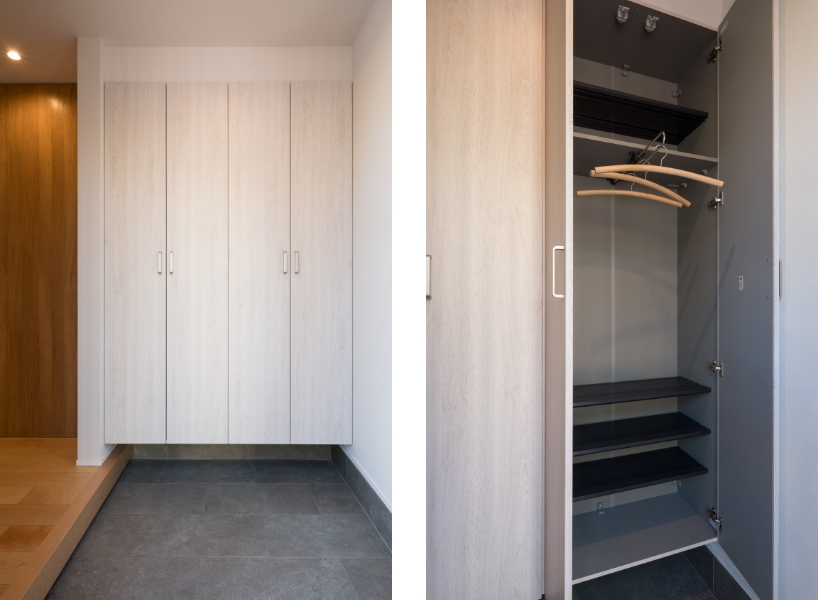 ❶シューズクローゼット:玄関に造作。クローゼット内は靴だけでなく、雨具などの衣類も収納可能。