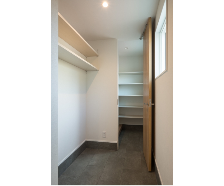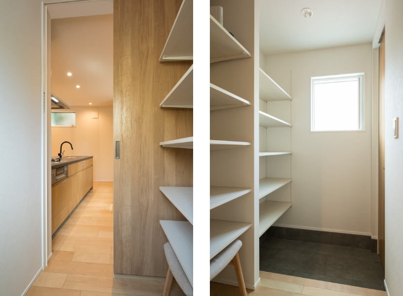 ❸パントリー:玄関収納奥には靴で入れるパントリー。食材の買い物帰りにそのままパントリーに直行できる。室内ドアの向こうはキッチン。動線に無駄がなく便利。
